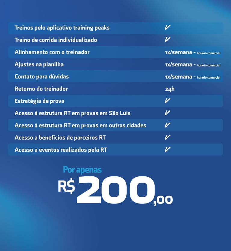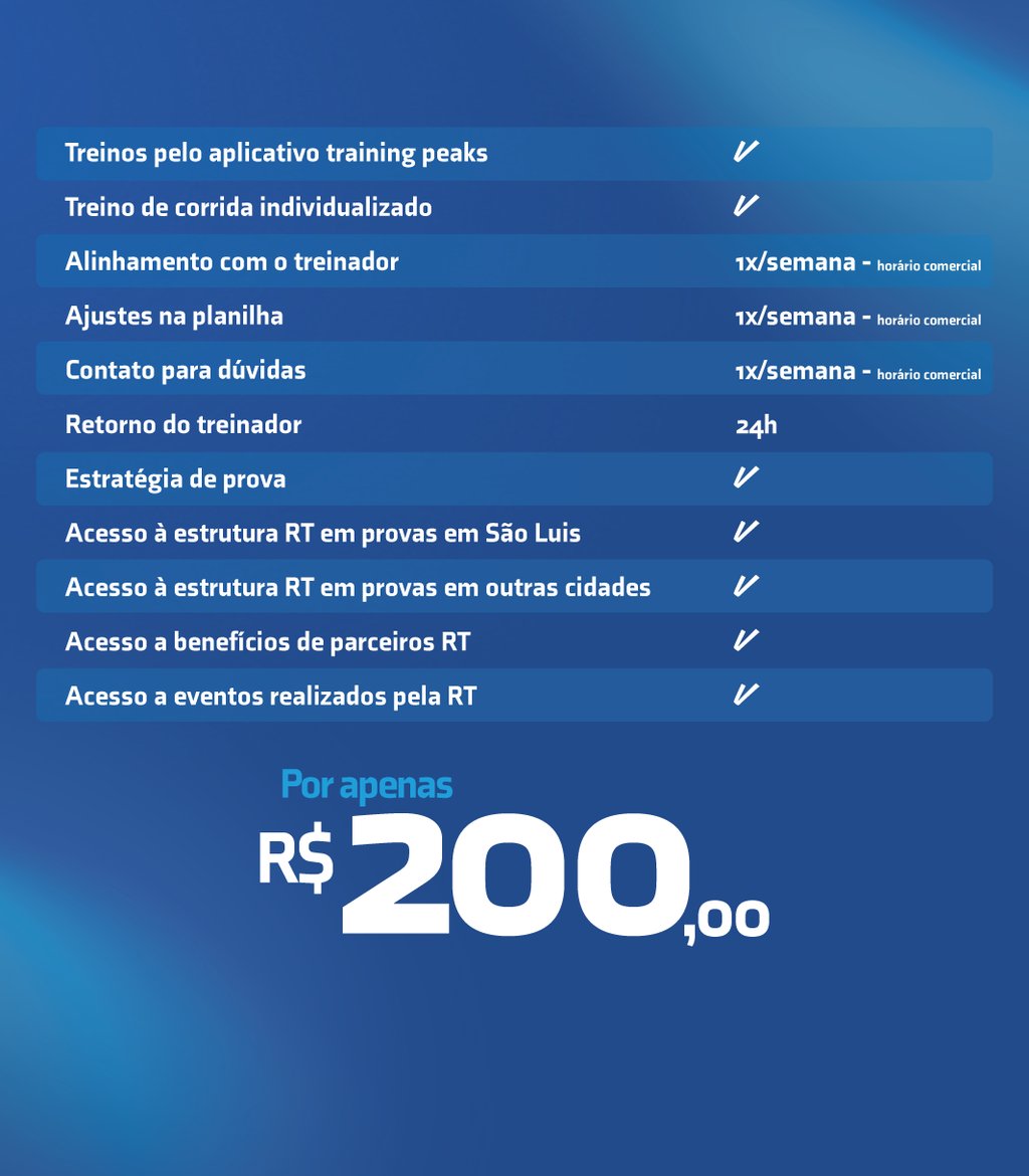 Com treinos presenciais em SãoLuís (MA) e suporte online em todo o Brasil e no mundo, a RT oferece planilhas personalizadas, acompanhamento técnico individual, avaliação constante de performance e treinos presenciais em grupo com foco na evolução de cada aluno.