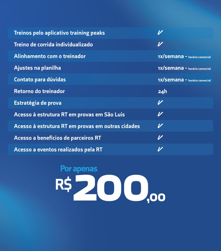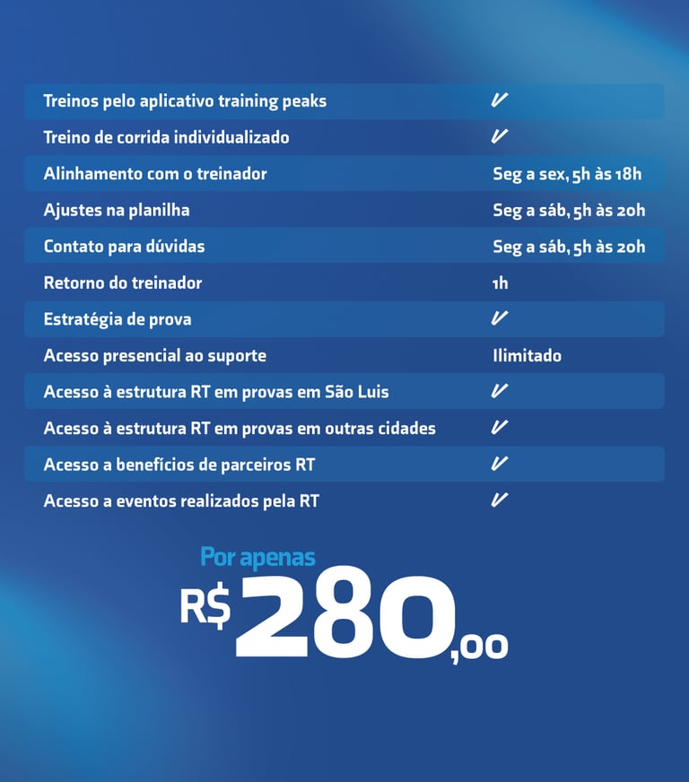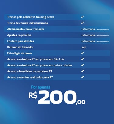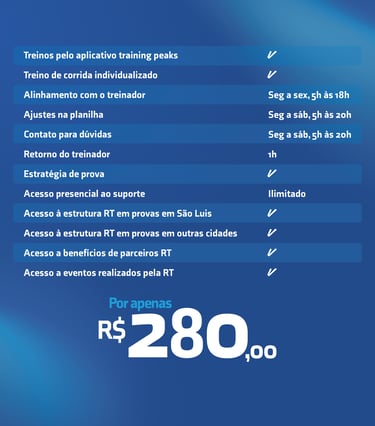 Com treinos presenciais em SãoLuís (MA) e suporte online em todo o Brasil e no mundo, a RT oferece planilhas personalizadas, acompanhamento técnico individual, avaliação constante de performance e treinos presenciais em grupo com foco na evolução de cada aluno.